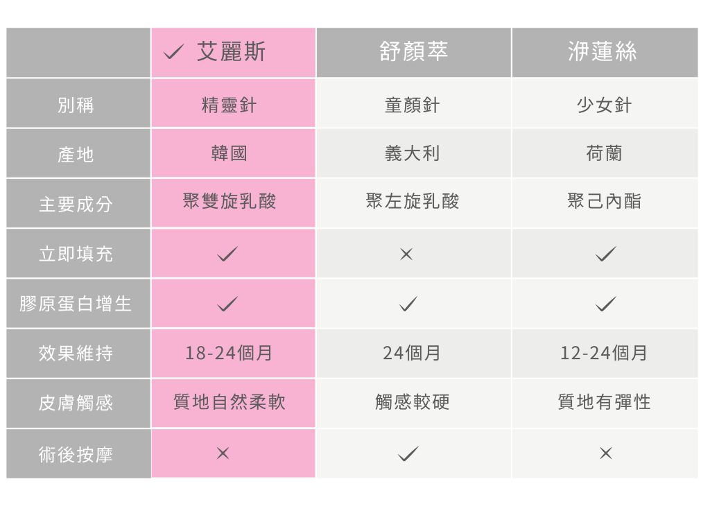 AesthFill 艾麗斯精靈針 第三代童顏針、精靈針、青春再生針 立即可見的填充效果,還能夠刺激人體的膠原蛋白、有效填補流失凹陷 膠原蛋白流失量決定衰老程度 隨著年齡的增長,皮膚裡的膠原母細胞變少,導致彈性蛋白減少,平均每年流失約1%的膠原蛋白,再加上紫外線照射、熬夜、睡眠不足破壞而造成結構變性,使得皮膚失去支撐與彈性,肌膚支撐力將變得不足,鬆弛凹陷、細紋皺紋、法令紋等老化現象隨之出現。 膠原蛋白流失的影響 表層皮膚:皮膚變薄、膠原蛋白減少、彈性纖維變形和彈性降低、保濕能力下降。 深層脂肪:脂肪重新分布、 堆積與萎縮導致臉部凹陷。脂肪墊變化造成輪廓缺陷。 肌肉:肌肉鬆弛、失去張力。 骨骼:骨骼尺寸與骨架消瘦。 骨質被吸收造成臉部體積流失、凹陷。 AestheFill® 艾麗斯(精靈針) 是一種新型態的聚『雙旋』乳酸(PDLLA),被稱為「第三代童顏針」、「百變精靈針」,專利多孔性微球體結構,能促進皮膚膠原蛋白及彈力纖維的生長,屬於自然再生型填充劑,維持⾃然豐潤效果可持續⼀年半⾄兩年以上。 百變精靈針 AestheFill®艾麗斯之所以被稱為「百變精靈針」,在於其具備了『洢蓮絲Ellansé』和『舒顏萃Sculptra』的特性。專為亞洲人設計,基本上全臉都可以注射。 最大的優勢是可經由醫師的判斷,調整溶解濃度,配合個人改善需求,客製專屬治療方案。濃度較高劑量時保有「洢蓮絲」的優點,可用於法令紋及蘋果肌等部位;而若是要細部微調,則可採取濃度較低的劑量,如此一來就能像是「舒顏萃」一樣,長效持續地刺激膠原蛋白。 什麼是聚雙旋乳酸(PDLLA)? 聚雙旋乳酸(常見名稱為艾麗斯精靈針),主要成分為PDLLA聚雙旋乳酸,包含聚左旋及右旋乳酸。成分來自玉米和馬鈴薯,純天然萃取而成的聚合物。 它可以刺激膠原蛋白,並用來改善細紋與膚質。其成分可以被人體吸收代謝,副作用比率極少,經FDA與世界各證實已於醫學臨床使用數十年,安全性高 青春再生支架-專利多孔性微球體 AestheFill艾麗斯(精靈針)的外觀為白色球體,使用前需用無菌水泡製30分鐘使其溶解。在高倍顯微鏡底下,會看到一顆顆有許多微小孔洞的球體構造,這些多孔性微球體可以使填充物更有效的與體內膠原白結合並刺激膠原蛋白,漸漸長出更多自己的膠原蛋白。 青春再生支架 AestheFill®艾麗斯(精靈針)的多孔性微球體(Microspheres)擁有多項全球專利,可當作肌膚青春再生支架,多孔性結構可以吸引纖維母細胞靠近,誘導膠原蛋白新生於多孔性微球體之間與內部。 艾麗斯精靈針-⻑效維持自然澎潤效果 艾麗斯(精靈針) 專為亞洲膚質研發設計及製造,刺激人體膠原蛋白療程後不易產生結節,皮膚自然柔軟、膚質緊緻,悄悄自然回溯年輕,效果維持長達18-24個月。 *AestheFill艾麗斯不同於市面上現有可矯特定部位的其他的填充劑。藉由積極地誘導新的膠原蛋白與組織,AestheFill艾麗斯可以矯正豐潤臉部整體區域以及維持更自然的體積很長一段時間。 艾麗斯精靈針青春秘密-膠原蛋白作用機制 當艾麗斯(精靈針)注入肌膚底層後,立即有澎潤效果。注射一周後多餘的水分會被吸收至體內,等待四到八週開始,聚雙旋乳酸成分會促進膠原蛋白的活動力,有效改善鼻淚溝、皺紋與面部整體問題,恢復臉部線條拉提飽滿。 艾麗斯精靈針施打前因老化流失 而形成的皺褶凹陷 注射當下治療部位注射後 能有效改善臉部凹陷 注射1~2週後一週後水分被吸收 只留下產品部分的支撐效果 注射4~8週後數週後膠原蛋白活動量 效果自然持久 艾麗斯精靈針-特色與優勢 安全:注射後被人體完全吸收,最後排出體外,注入真皮層後2至4週不易移動,不位移,結節發生率極 低,副作用比率極少。 自然:專門為亞洲膚質設計,皮膚自然柔軟不需特別按摩(以醫師評估為主),效果維持長達24個月 百變:百變濃度,可泡濃或泡稀使用(1.4~8mL),客製化的濃度調整,符合客戶需求 速溶:易稀釋,現泡現溶現打,治療更安心,速溶科技,不易堵針,好施打 生長因子精靈針 艾麗斯精靈針結合PRP表皮層修補 生長因子精靈針是我們的特殊療程,利用『艾麗斯精靈針』改善皮膚深層因膠原蛋白流失而造成的臉部鬆垮、下垂,接著再利用『PRP生長因子』修復皮膚表層。 PRP生長因子是從自身血液中單獨取出的高濃度血小板血漿,可釋放大量生長因子加快細胞修復和癒合,注入皮膚後能協助修補惱人的痘疤、凹洞、傷口、毛孔粗大、色素沈澱等問題。 艾麗斯精靈針+PRP,雙重療程同時運行,從裡到外不放過任何肌膚死角,讓您不只有柔軟澎潤的臉蛋,還有個人人稱羨的平滑細緻肌膚。 自體膠原蛋白增生劑產品比較 聚雙旋乳酸是一種新型態的『自體膠原蛋白增生劑』由於能恢復青春、增加皮膚彈性與緊緻度等優點,因此又被譽為「童顏針」。 目前台灣合法的膠原蛋白增生劑只有3種, 分別為舒顏萃(第一代童顏針)、洢蓮絲(第二代少女針)及艾麗斯(第三代精靈針)。可透過專業醫師的諮詢建議,找出最適合您的產品與療程方案: 艾麗斯精靈針適用部位 艾麗斯精靈針適合用於各種皺紋填補與臉部整體膠原蛋白增生等需求,包括太陽穴(夫妻宮)凹陷、蘋果肌、雙頰凹陷、法令紋、木偶紋(口角紋)、下巴線條及臉部皮膚的鬆弛下垂都能改善,運用範圍非常廣泛。 療程效果術後照 最乾淨無塵的精靈針診療環境無塵室診間規格 杜絕所有感染的可能本診所空間